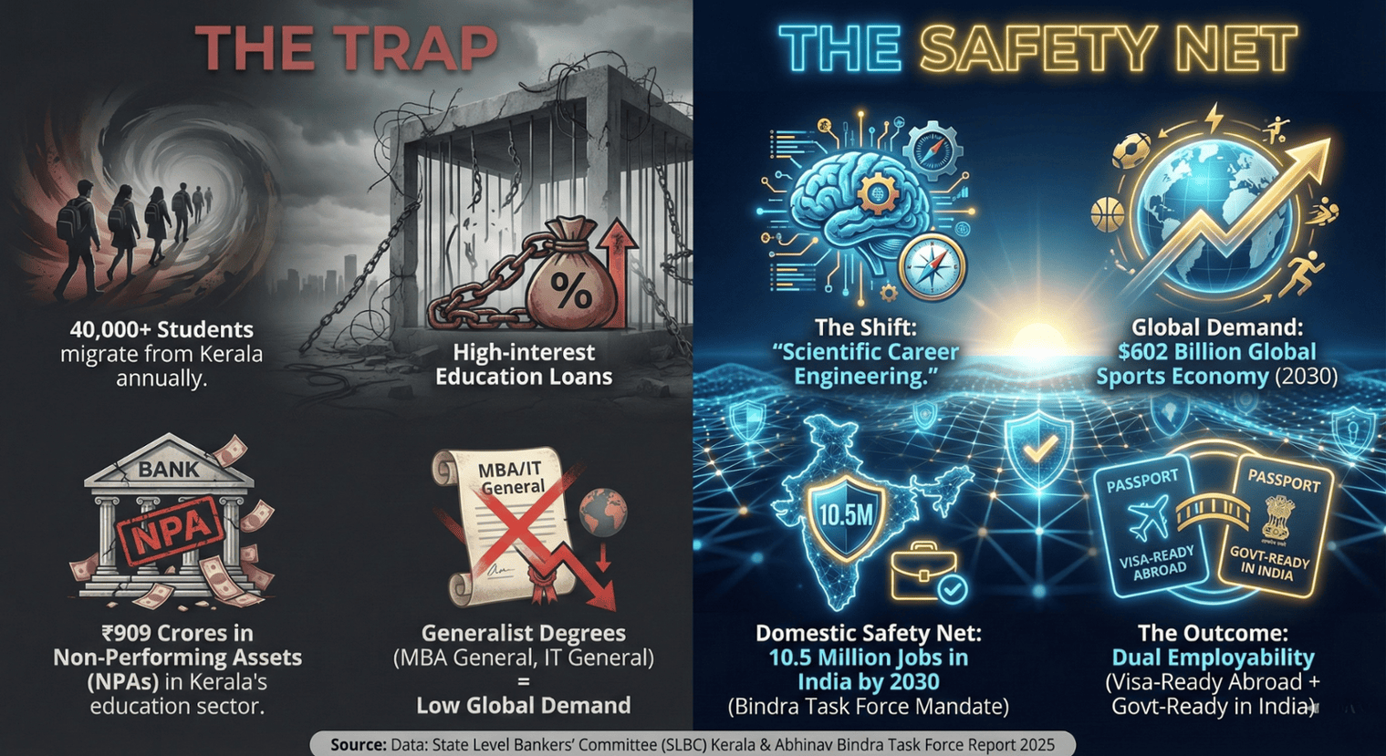 If you return, you enter an ecosystem starving for specialists. The 2025 Bindra Task Force explicitly identified a 'Human Capital Deficit' in Indian sports governance. Foreign credentials make you eligible for the new 'Professional Cadre' within SAI and the Kerala Sports Economy Mission, commanding a salary premium of 200% over domestic peers (₹12L vs ₹4L) to lead India's 2036 Olympic roadmap.