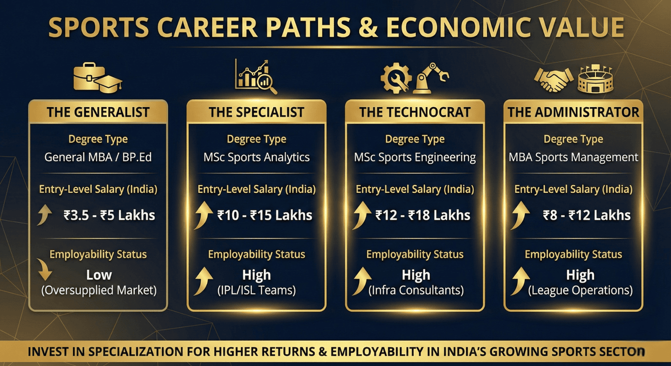 The Salary: A UK-trained "High Performance Manager" commands a starting salary of ₹12-18 Lakhs in the Indian private leagues (IPL, ISL, Prime Volleyball), compared to ₹4 Lakhs for a domestic BP.Ed graduate.